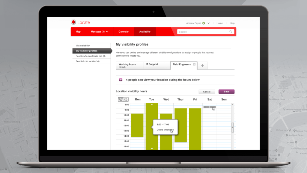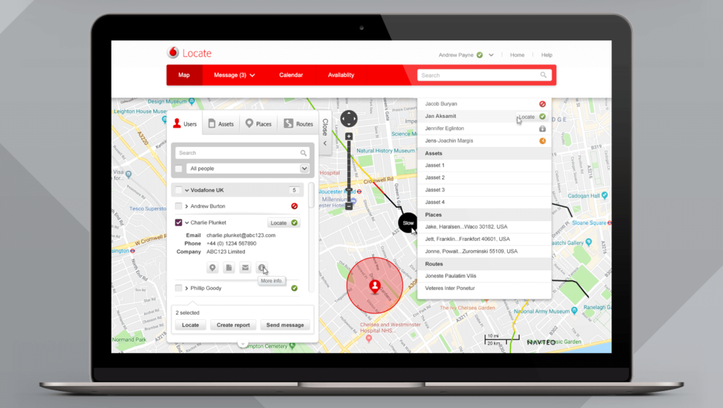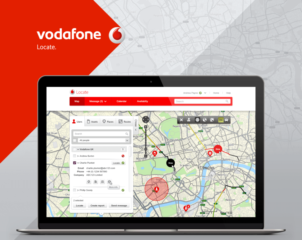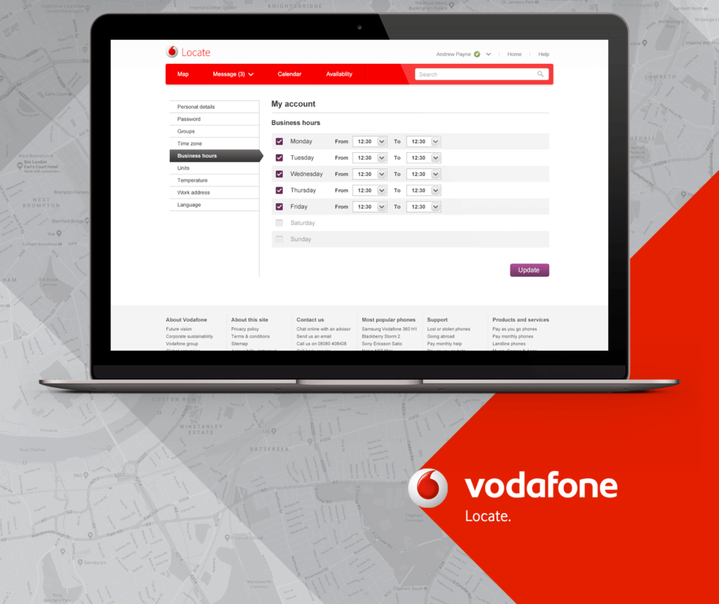 One of the more significant projects I contributed to was Locate, a fleet tracking online application. I was tasked with getting the project back on track after Vodafone’s creative agency failed to grasp the branding and UI. I successfully delivered a comprehensive design solution, encompassing the map user interface, messaging, calendar, and admin area. The project spanned six months, from conceptualization to launch.